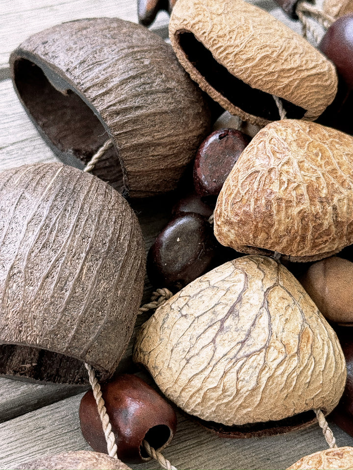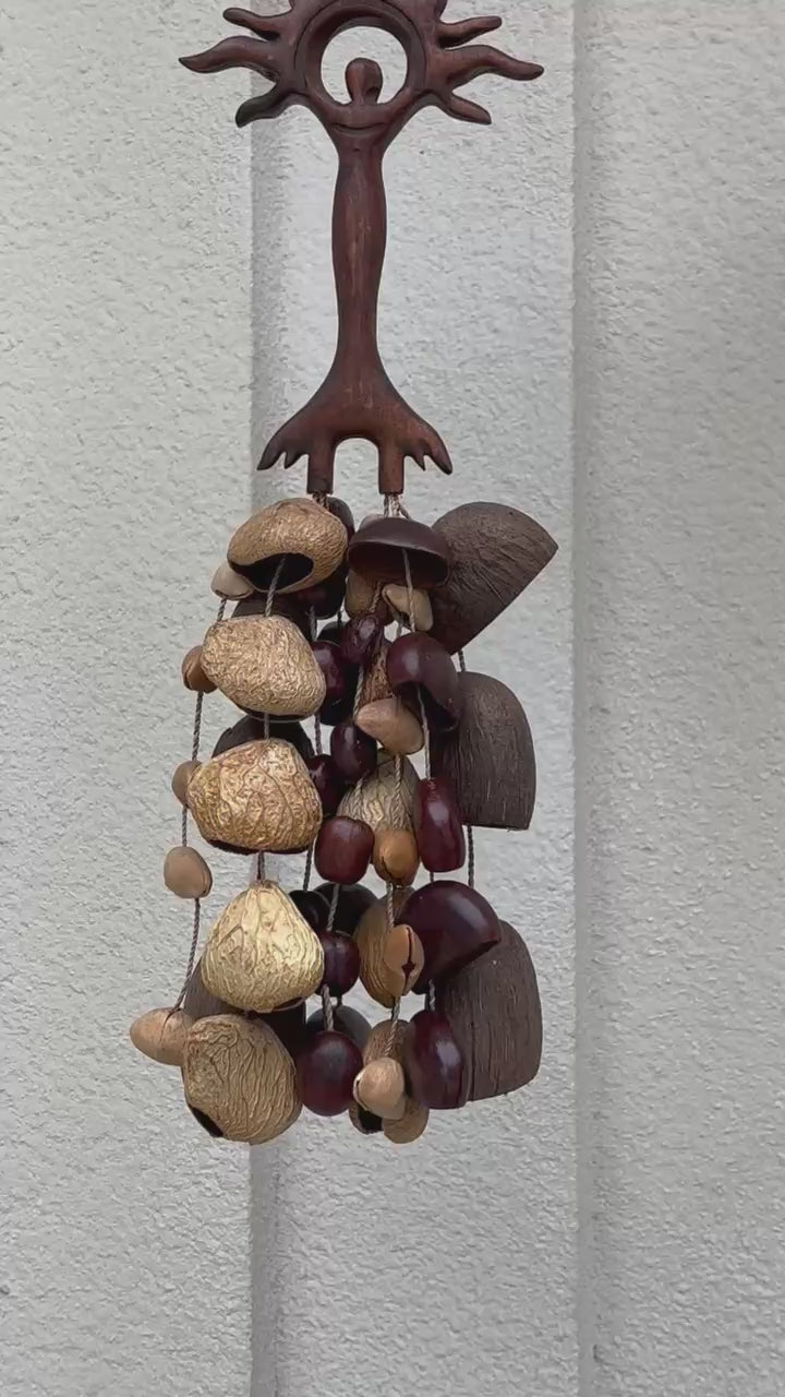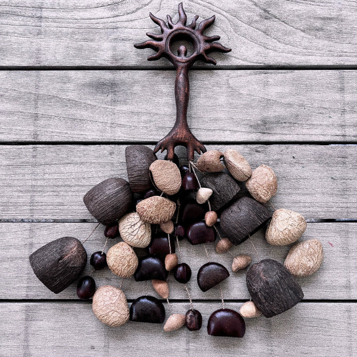 A hand bell crafted from five natural seed shells resonates in harmony, creating the soft babble of running water. The goddess-shaped handle lifts this melody with sacred elegance, embodying purity.